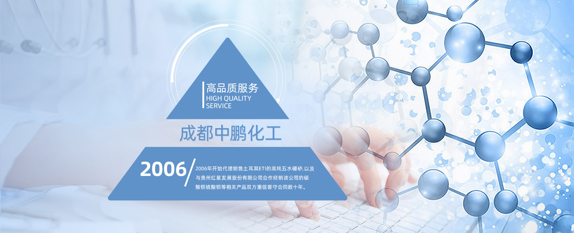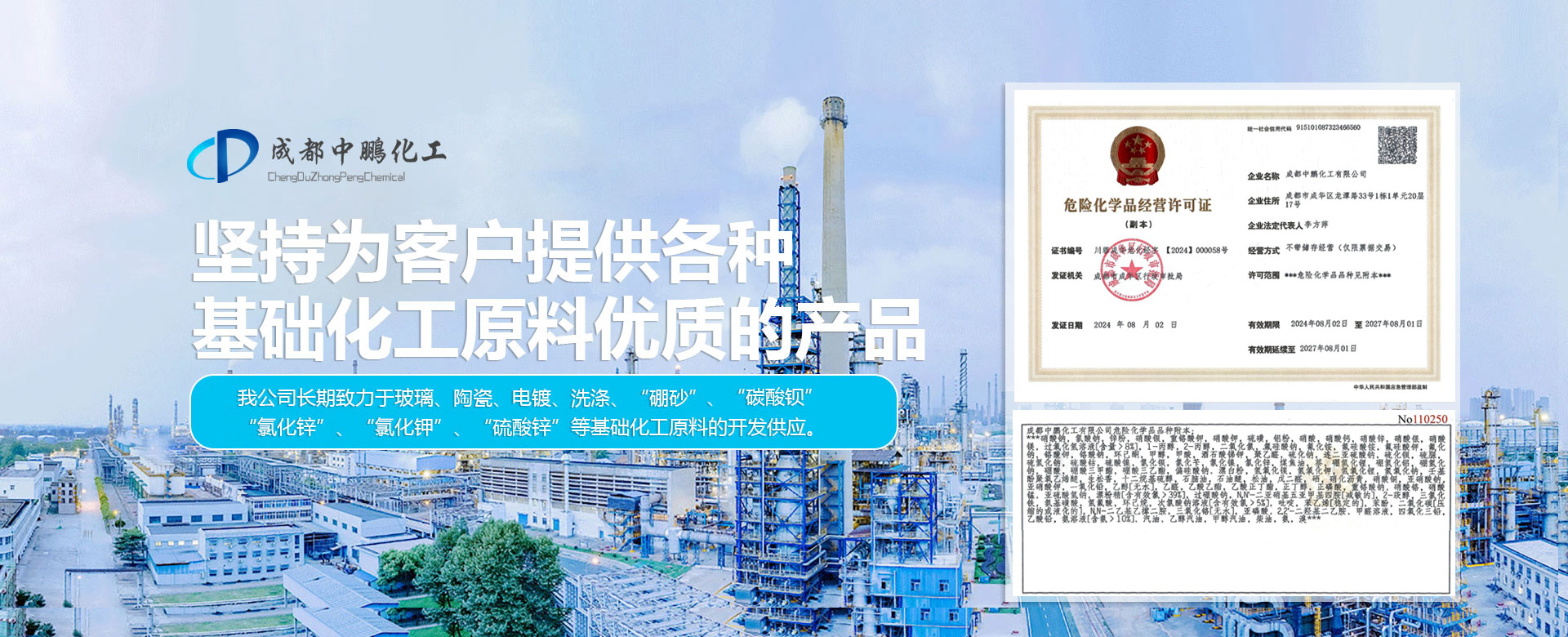 成都中鵬化工有限公司成立于2001年,位于成都市新都區(qū)木蘭木名商塑化城2棟11號(hào),公司成立16年以來(lái),一直堅(jiān)持為客戶提供各種基礎(chǔ)化工原料的產(chǎn)品。我公司長(zhǎng)期對(duì)于玻璃、陶瓷、電鍍、洗滌、“硼砂”、“碳酸鋇”、“氯化鋅”、“氯化鉀”、“硫酸鋅”等基礎(chǔ)化工原料的開(kāi)發(fā)供應(yīng)。 公司現(xiàn)在員工上百人,在全國(guó)擁有多個(gè)營(yíng)銷體系和完善的售后服務(wù)體系,長(zhǎng)期以來(lái),通過(guò)為客戶提供各種基礎(chǔ)化工原料的產(chǎn)品,形成了良好的合作關(guān)系...
